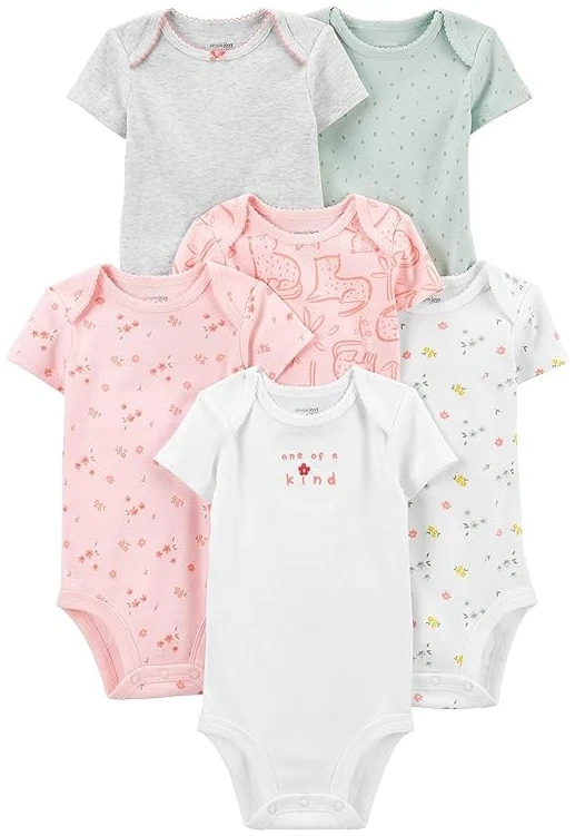 • Six Short-Sleeve bodysuits in baby-soft cotton featuring stripes, prints, and solids