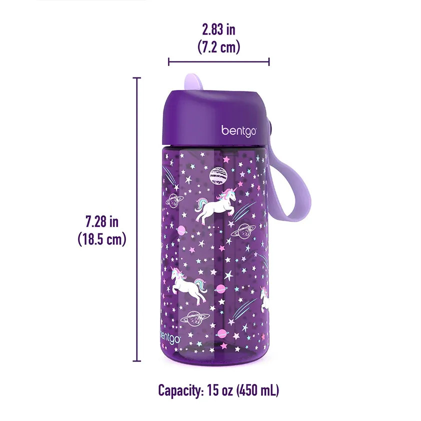 - PERFECT FOR KIDS: Our larger water bottle for kids holds 15 ounces of liquid to encourage hydration during every part of the day. Showcase your child’s personality with the variety of fun prints and patterns that can even be matched with our other Bentgo Kids lunch boxes, lunch bags, backpacks, and ice packs! Recommended for kids ages 3 and up.