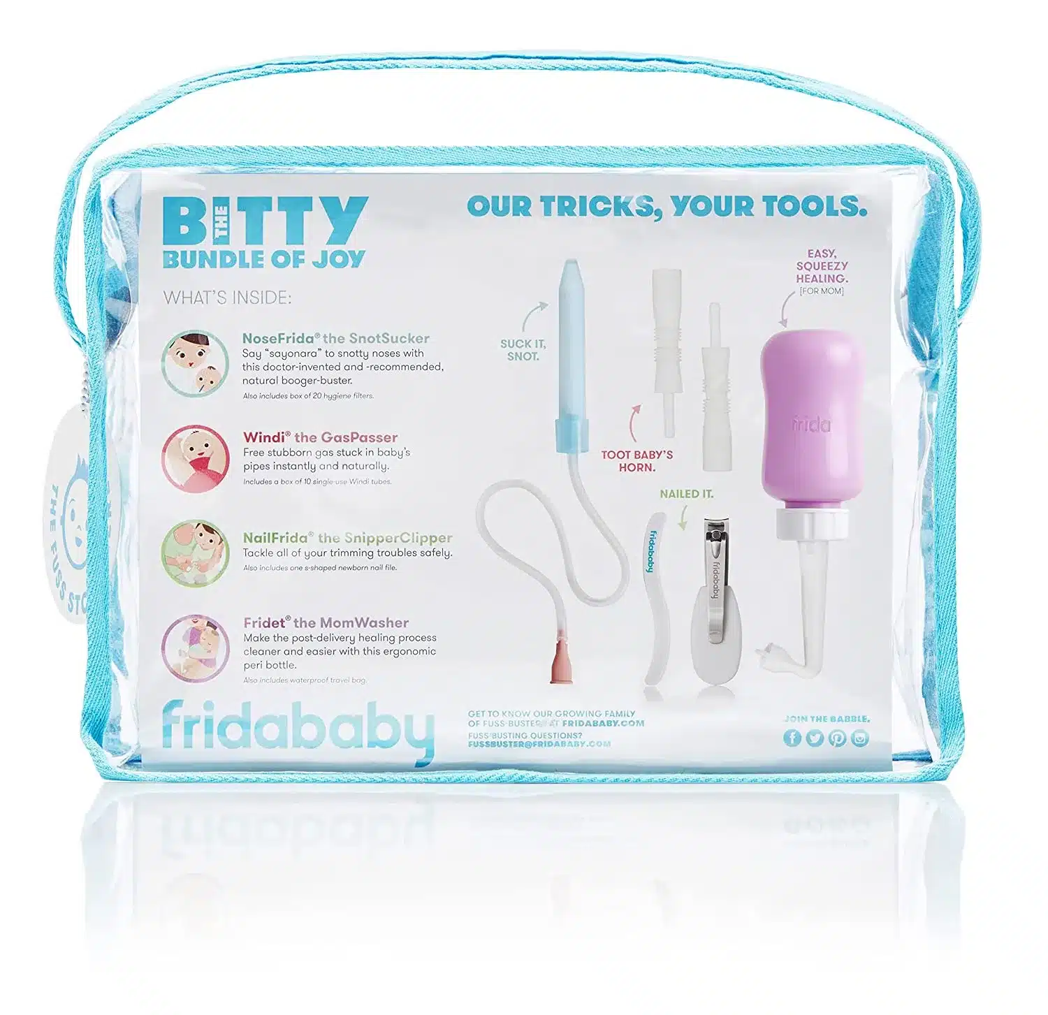 The Bitty Bundle of Joy from Frida baby is the perfect fuss-busting starter kit for new parents. Featuring Nose Frida, the pediatrician recommended booger buster, the Bitty Bundle of Joy also comes equipped with Windi, the all-natural gas passer, and Nail Frida for those intimidating baby mani-pedis. Plus, new moms will appreciate Fridet, the postpartum peri bottle that makes washing down there easy squeeze-trust us, a hospital bag must-have! The Bitty Bundle of Joy comes packaged in a convenient carry case to keep all of the tools in one place, making it the perfect gift for new parents and parents-to-be.