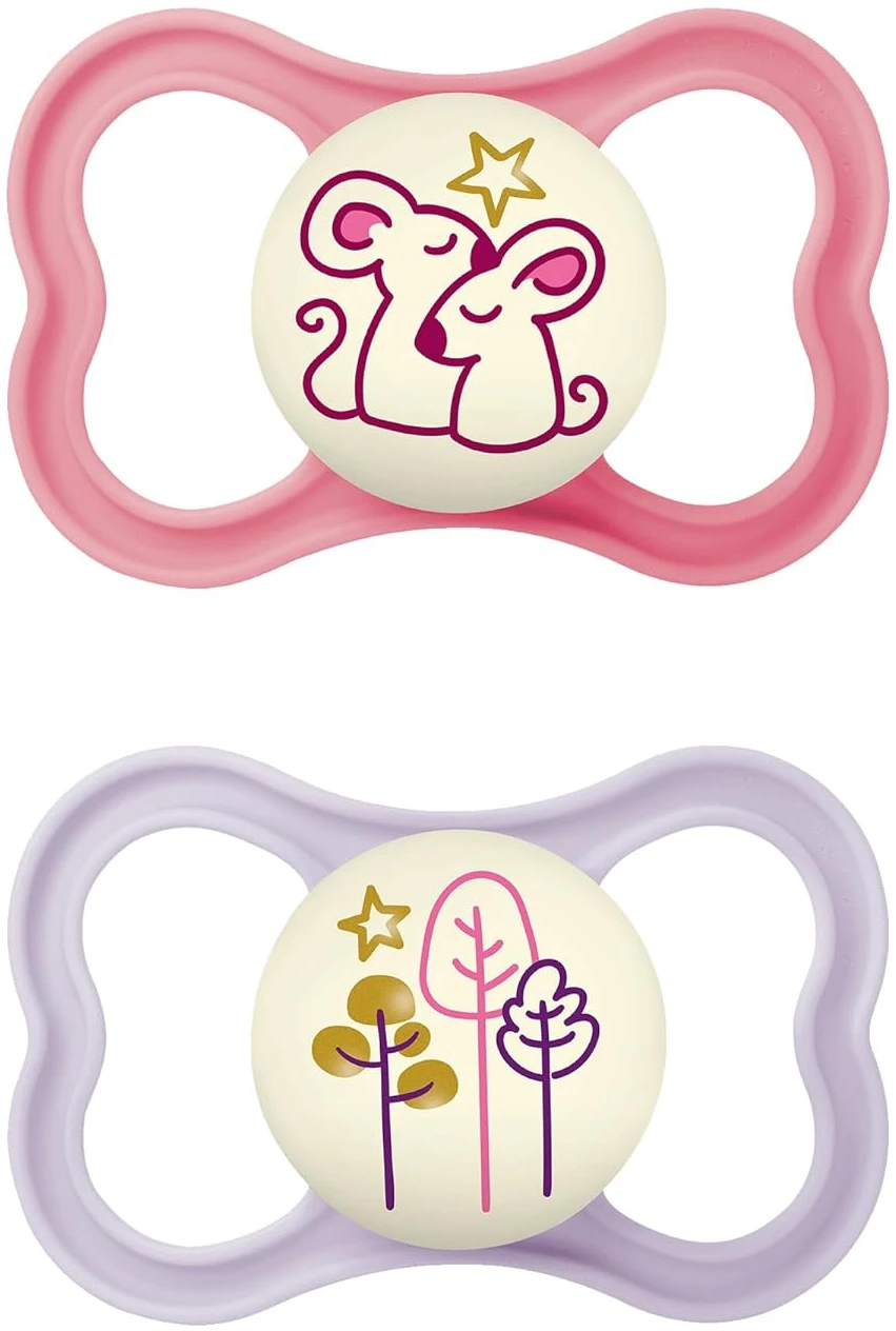 MAM Air Night Baby Pacifiers for Sensitive Skin, Glows in The Dark, 2 Count, 6-16 Months, Girl