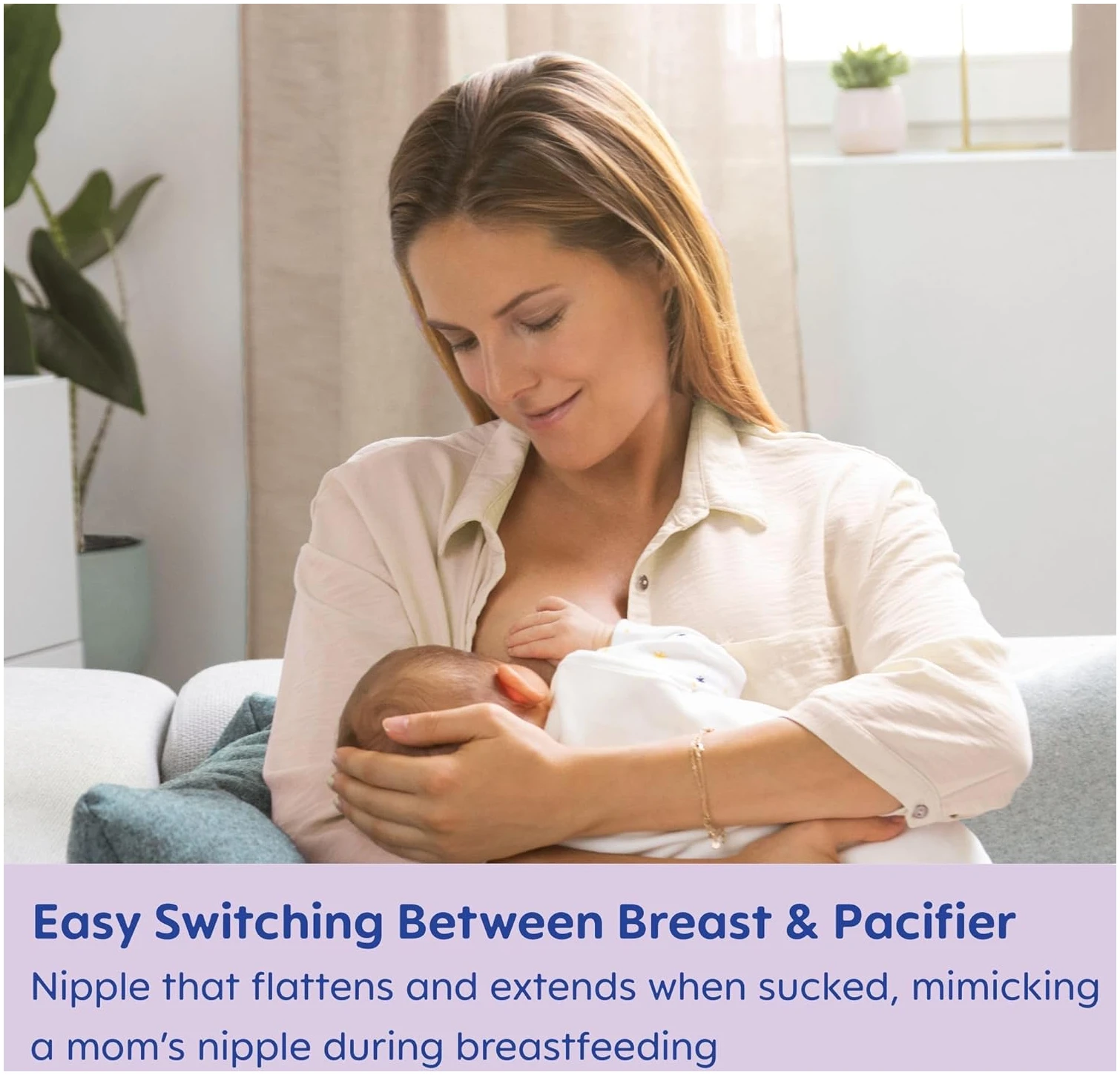 - SYMMETRICAL DESIGN: The breastfeed pacifier for babies is fun and functional. The curved shield with wide openings are always right-side up and prevent skin irritation with maximum airflow.