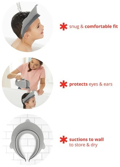No more tub time tears! Thanks to comfy, flexible material for a custom fit, our cute baby and toddler bath visor creates a snug seal to protect little one’s eyes and ears from water and shampoo. An open back makes hair washing easy, while a built-in suction cup lets you hang it on the wall to dry and store.