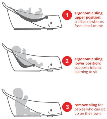 - Mesh Smart Sling™ locks into two ergonomic positions: Upper position: Offers head-to-toe newborn cradling; Lower position: Supports infants learning to sit