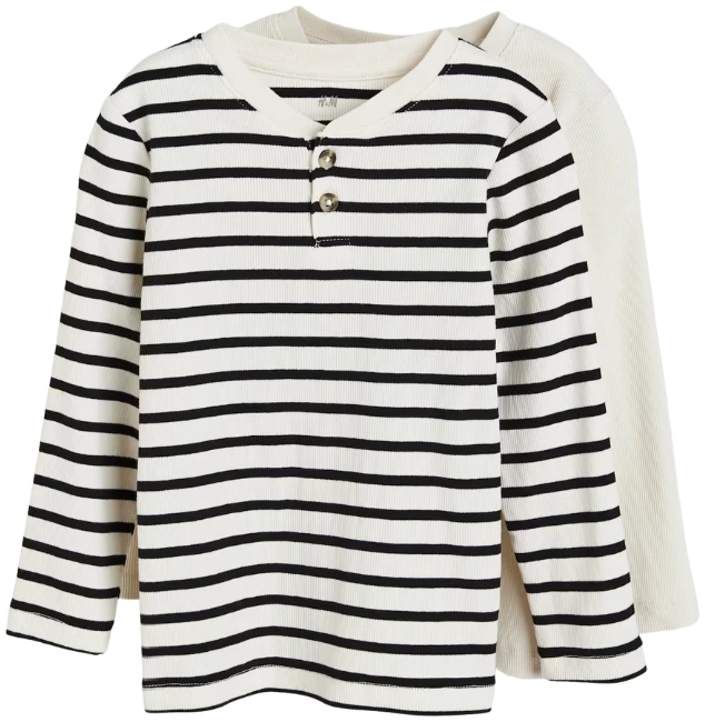 Long-sleeved tops in soft, ribbed cotton jersey with a trim around the neckline and a button placket at the top.