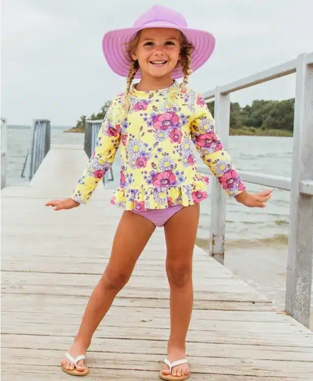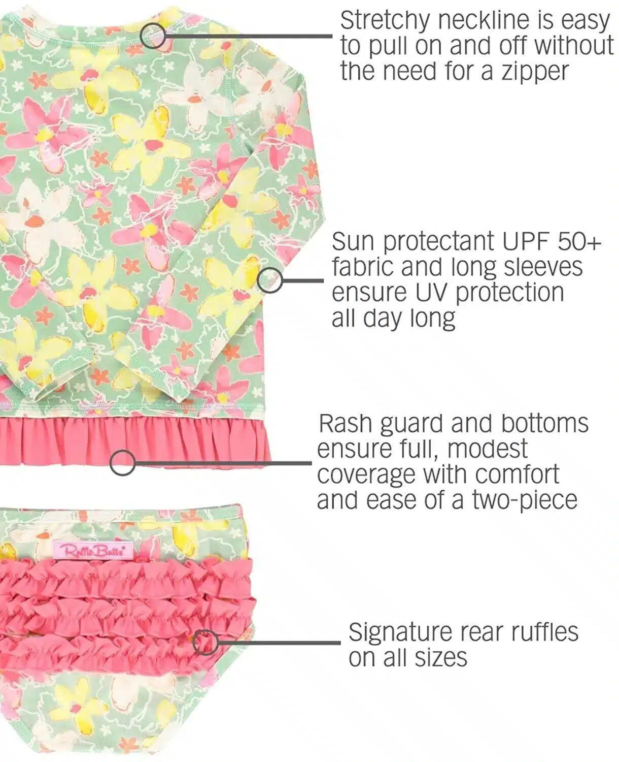 - BUILT-IN SUN PROTECTION – Keep your little girl’s delicate skin safe in the sun! RuffleButts features built-in UPF 50+ so there’s more playing and less worrying about harsh UV rays. Perfect for the beach, lake or pool!