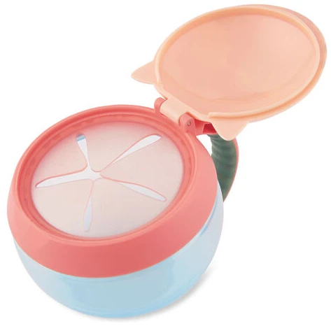 Perfect for toting munchies, this cute cup encourages independent snacking without the mess. The easy-grip handle is sized just right for little hands, and the snap top lid ensures food stays fresh. The flexible inside opening keeps snacks from spilling out—even if it’s tipped over. With two lids there’s less mess and everything stays crumb-free!